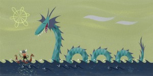 Demonstrating his advanced leadership skills, St. Columba ordered one of his followers, a poor sap named Luigne moccu Min, to swim across the river. As the story goes, the big scary critter gave chase, but was stymied by St. Columba’s great faith and Dr. Doolittle-ish skills. The pious pastor crossed himself, and said, “Go no further. Do not touch the man. Retreat immediately!” According to Adomnán, the critter halted as if it had been tethered, and fled in terror. And there was great rejoicing.